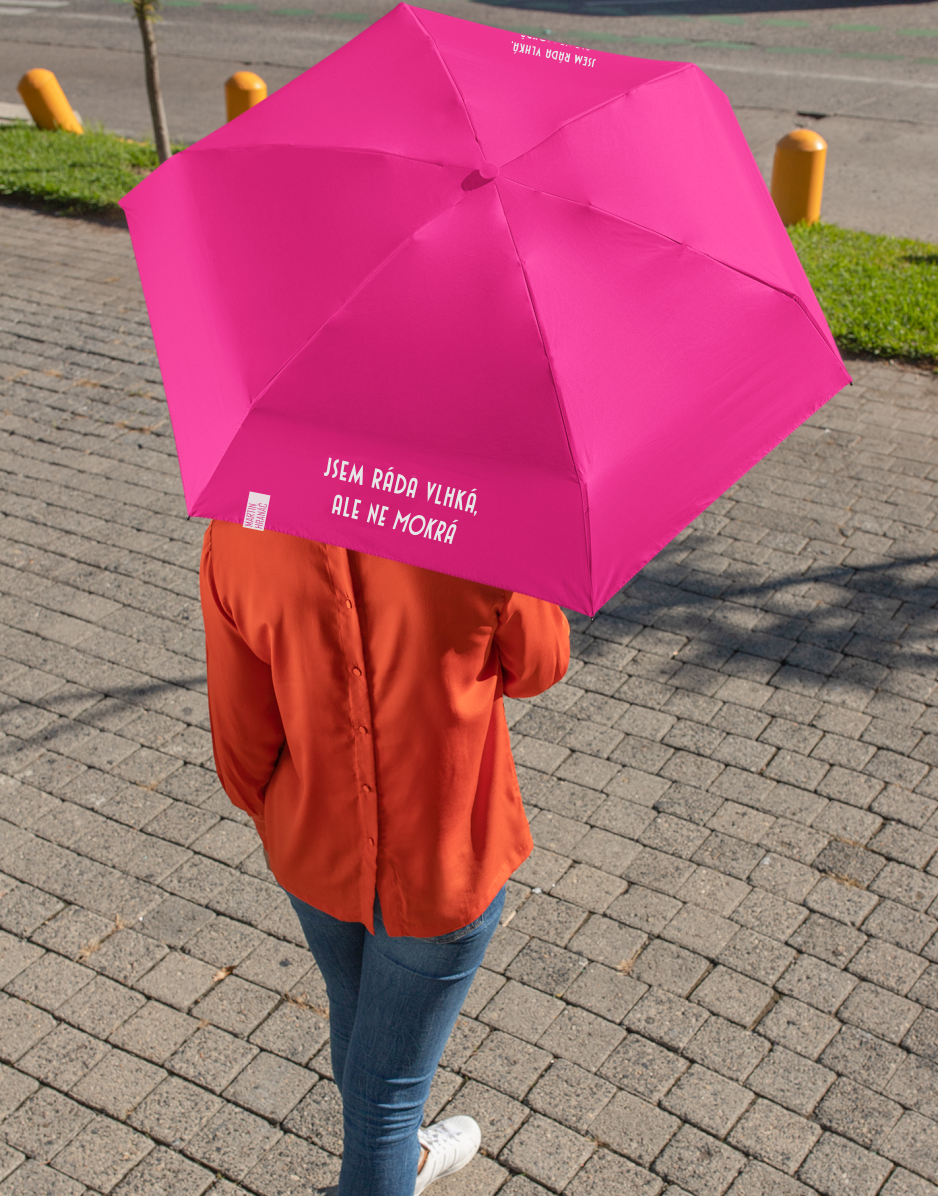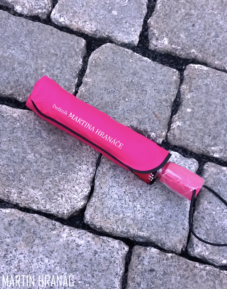 - potisk s textem "Jsem ráda vlhká, ale ne mokrá" na dvou polích + našitý štítek na hraně deštníku s logem Martina.