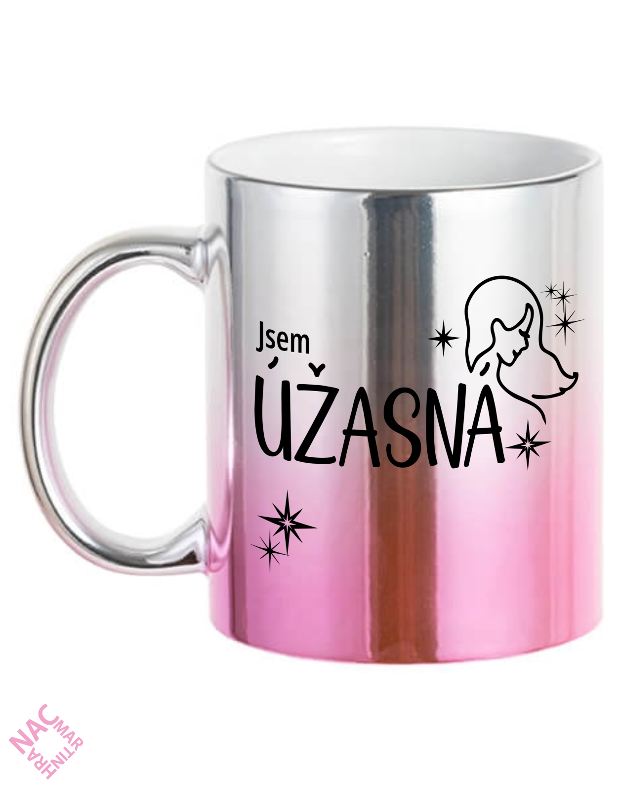 Růžovo chromový hrníček s potiskem "Jsem úžasná"