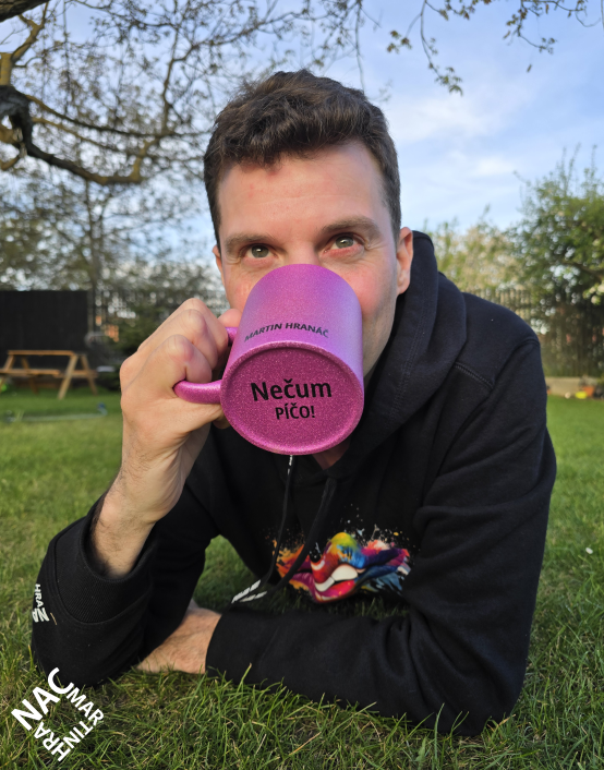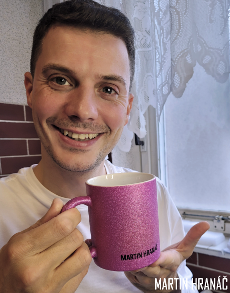 - Třpytivý hrnek s decentním potiskem loga Martina u spodní hrany hrníčku.